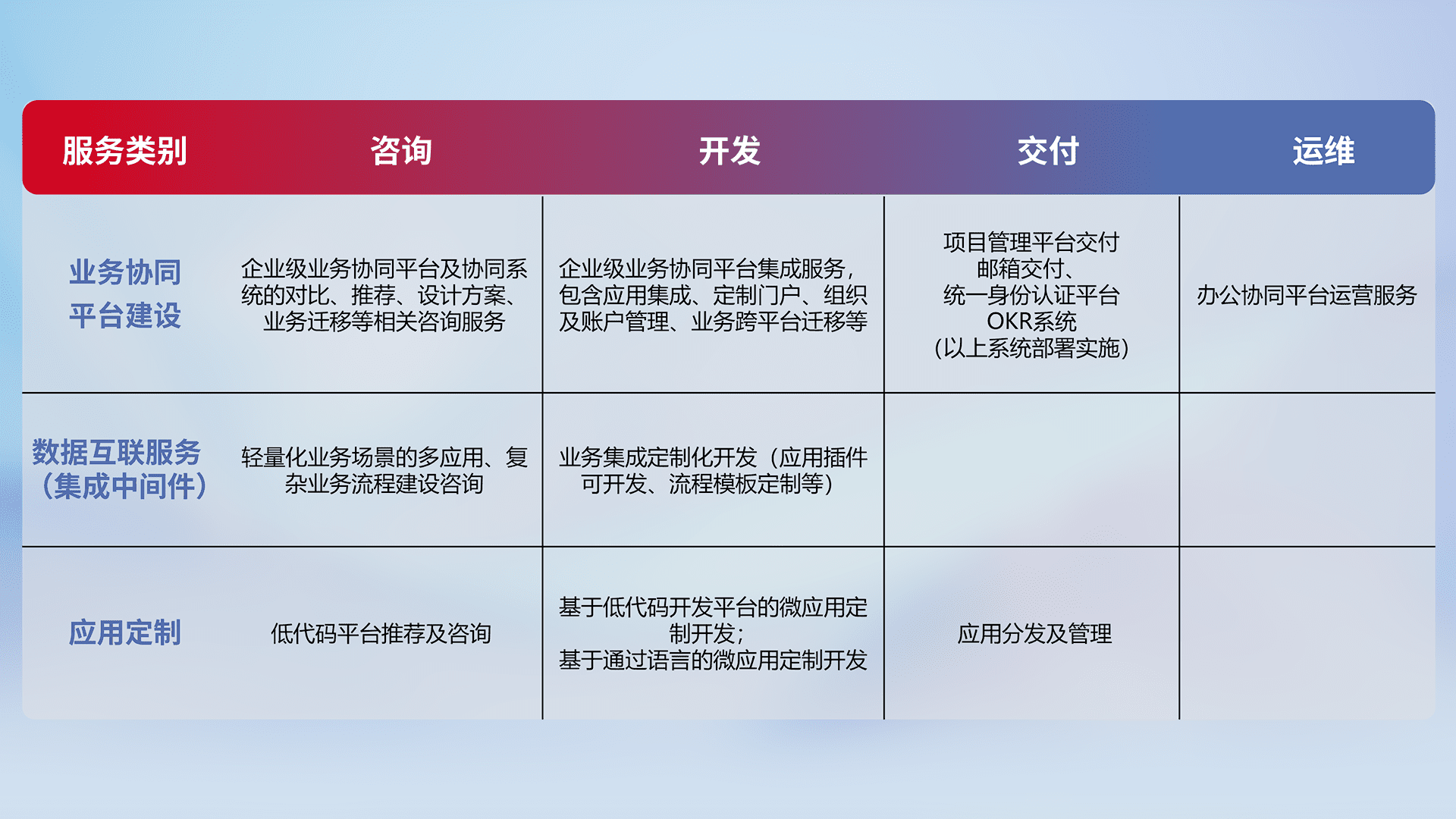 针对钉钉、、、企微、、、、IDaas等平台级产品提供产品的规划、、方案、、、、交付、、定制化开发等服务,,实现如统一协同办公、、、智能客户服务、、、混合会议管理、、智能数据查询、、等业务场景,,,,实现数字化转型。。。
